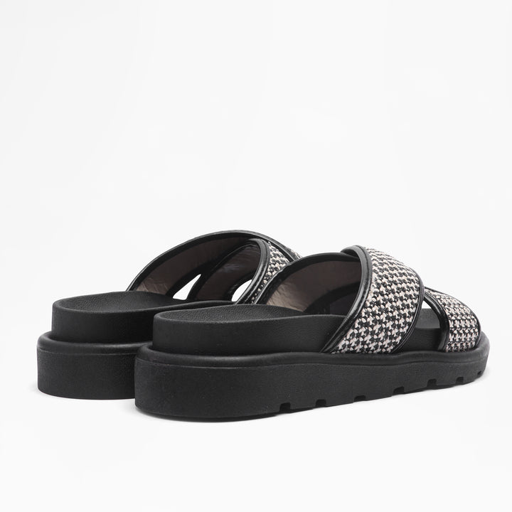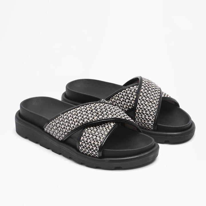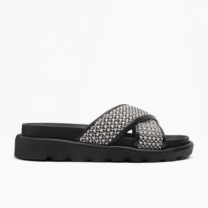Experience refined comfort with the Woven Cross-Strap Slides in Black. Expertly crafted, these slides feature a durable woven cross-strap design that ensures a secure fit while providing breathability. Their sleek black finish offers versatile style, perfect for both casual outings and relaxed indoor wear. Designed for ease and lasting wear, these slides combine functionality with understated elegance.
