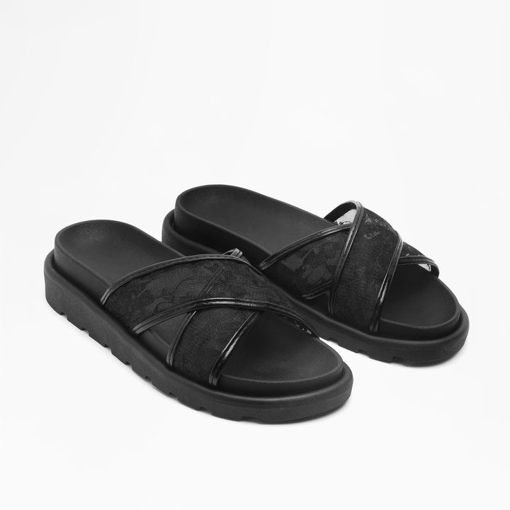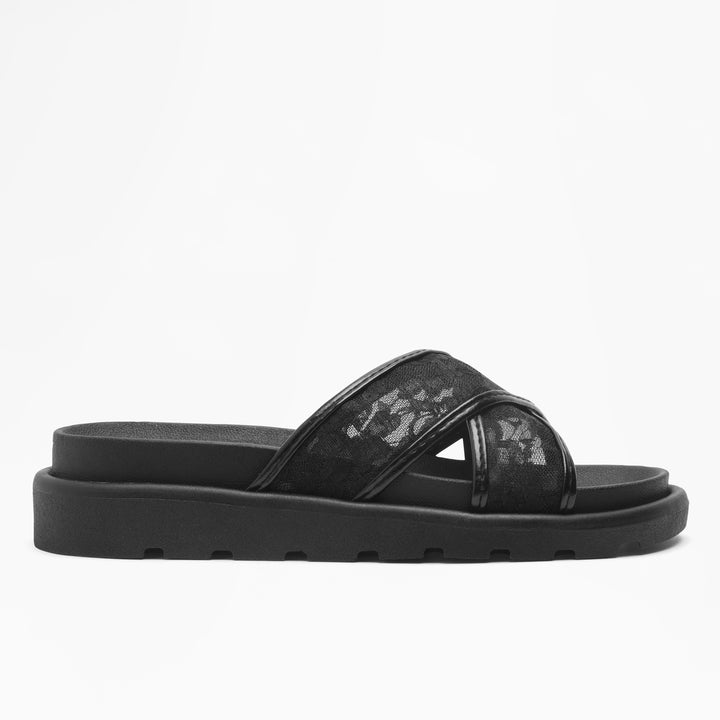 Elevate your footwear collection with the Sheer Cross-Strap Slides in Black. Designed for both style and comfort, these slides feature sleek, intersecting straps that provide a secure fit while maintaining a minimalist aesthetic. The black finish ensures versatility, making them suitable for casual outings or relaxed indoor wear. Crafted to offer ease of wear and durability, these slides are an expert choice for those seeking understated elegance combined with everyday practicality.
