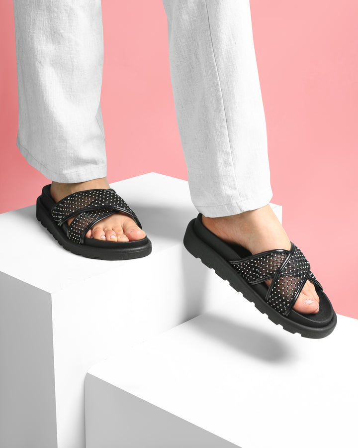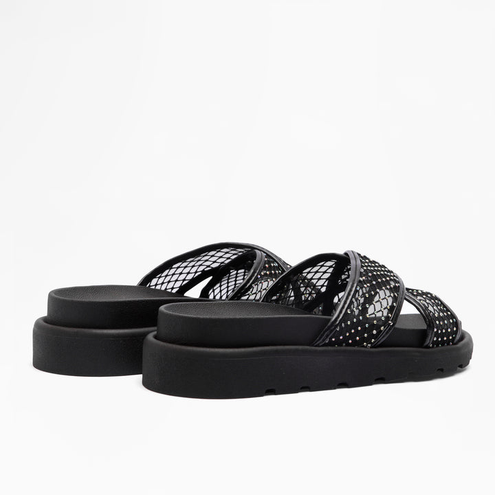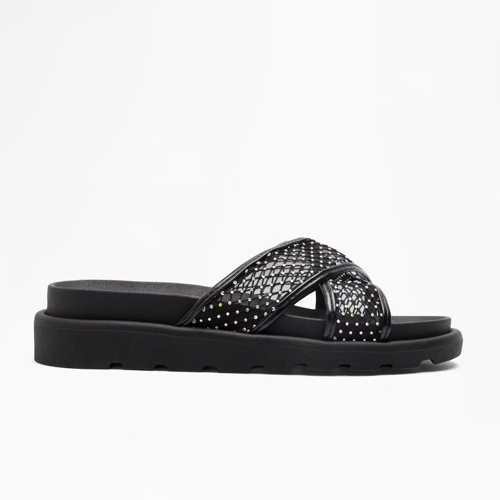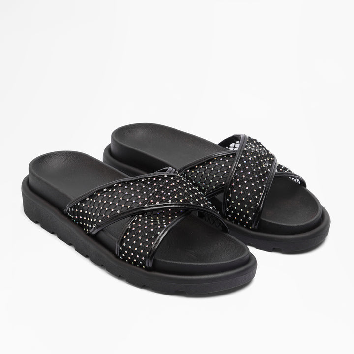 Elevate your casual footwear with the Sparkle Cross-Strap Slides in Black. Designed for both comfort and style, these slides feature a sleek cross-strap silhouette that ensures a secure fit. The subtle sparkle detail adds a refined touch, making them versatile for day-to-night wear. Ideal for effortless pairing with various outfits, they provide reliable support and a modern aesthetic for the discerning wearer.